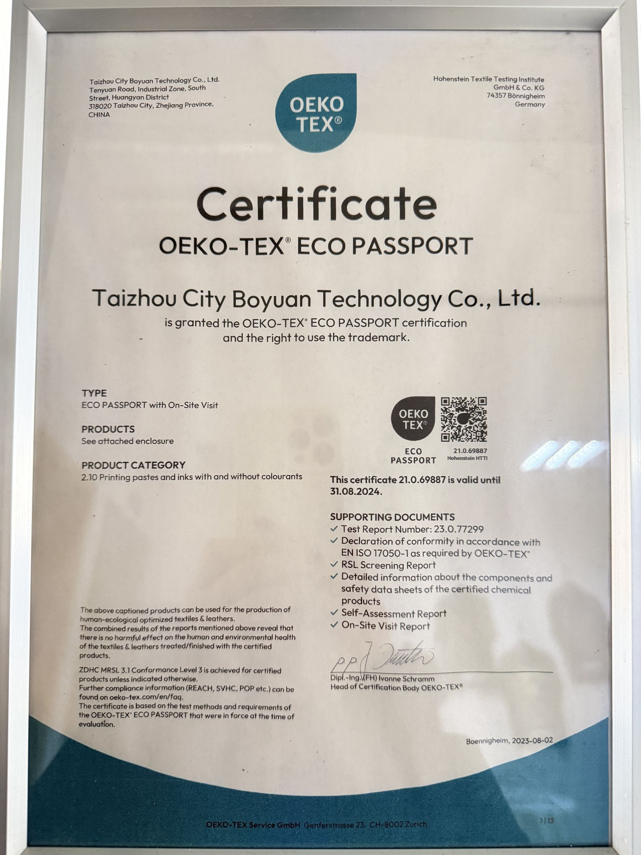 2022年通过了纺织行业瑞士OEKO-Tex ZDHC level3级认证;另外如必维检测、SGS等检测证书会定期检测!